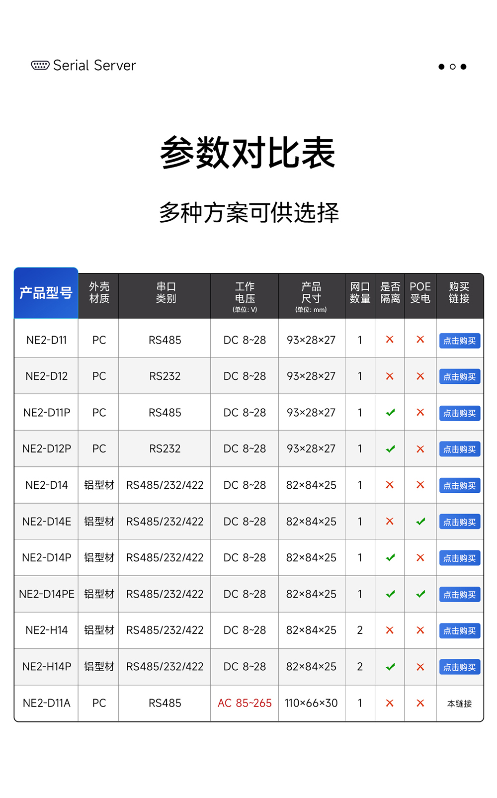 | NE2-D12E | RS485 | 以太网 | TCP/UDP、MQTT、HTTP、IPv4、DHCP、DNS | - | DC 8~28 | 110*66*30 | POE受电、RS485串口数据⇌以太网数据透明传输 | ||